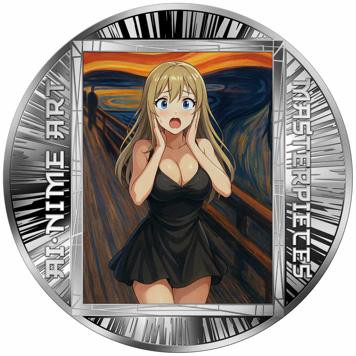 AI•NIME Art Masterpieces, превращая легендарную картину Эдварда Мунка «Крик» в захватывающую интерпретацию аниме-манги. В центре реверса, в искусно отчеканенном мотиве деревянной рамки, находится яркая, полноцветная аниме-интерпретация «Крика», запечатленная в мельчайших деталях. Элегантно расположенные по обе стороны рамки надписи «AI•NIME Art» и «Masterpieces», подчеркивающие название серии. Вокруг центральной рамы находятся прекрасно стилизованные абстрактные элементы, художественно расположенные для дополнения и улучшения центрального изображения, придавая монете отличительный современный, но классический вид.