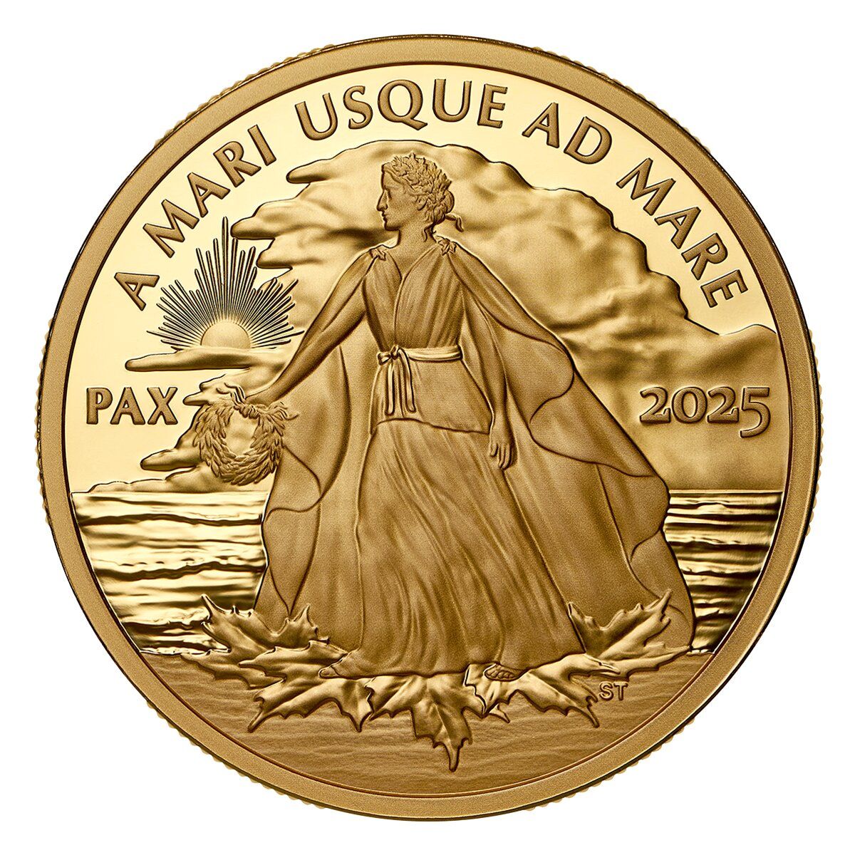 изображен портрет Леди Мир в полный рост, олицетворение Мира («PAX»). Вдохновленная аллегорической фигурой на вершине Национального военного мемориала в Оттаве, Леди Мир одета в струящуюся мантию и увенчана венком из кленовых листьев и оливковых ветвей, выражающим основную канадскую ценность мира. Ее безмятежное лицо излучает уравновешенность, силу и тихую уверенность, когда она протягивает правую руку, почти как будто венок мира, который она держит, является подношением всем. Леди Мир стоит на берегу и поддерживается кленовыми листьями, которые символизируют Канаду, в то время как девиз Канады «A MARI USQUE AD MARE» («От моря до моря») появляется в небе над головой, где солнечные лучи прорываются сквозь дождевые облака и образуют форму кленового листа.