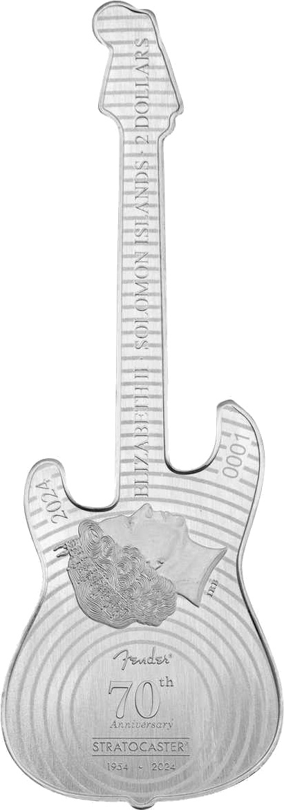 Монета 2 бакса Соломоновых островов, Соломоновы острова выпускает в обращение монету номиналом 2 доллара Гитара Fender Stratocaster, которая выходит в одноименной серии к 70-летию со дня создания этого музыкального инструмента.