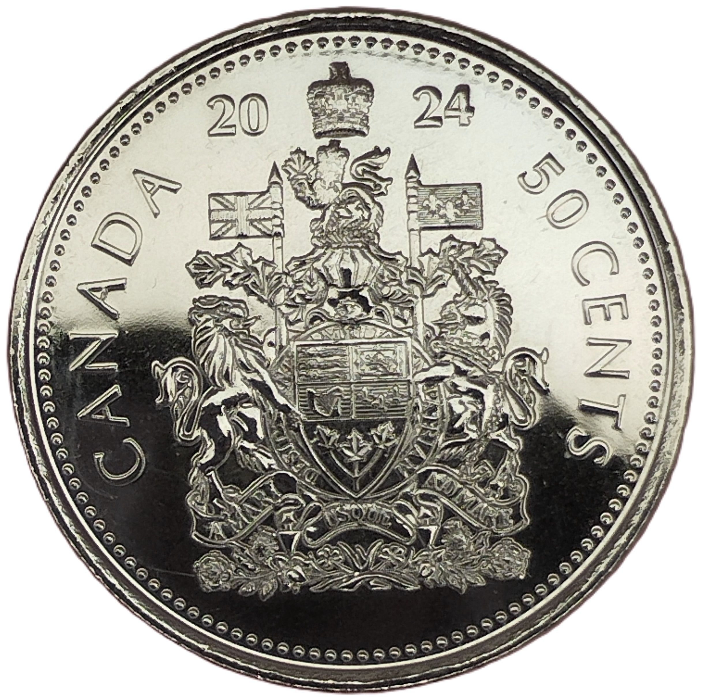 Монета 50 центов Канады, в конце 2024 года Royal Canadian Mint of Ottawa по поручению Национального Банка Канады (Bank of Canada) отчеканил медно-никелевую монету 50 центов Смена Монархов.