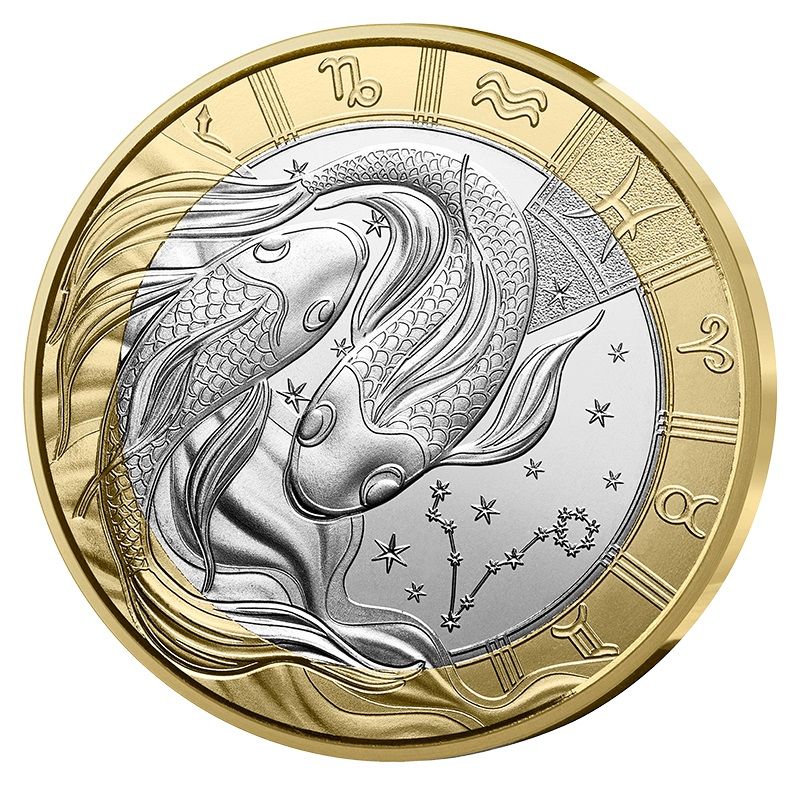 Пять евро Франции, в 2025 году Франция выпускает в обращение памятную медно-никелевую монету 5 евро Рыбы, которая выходит в серии “Знаки зодиака”.