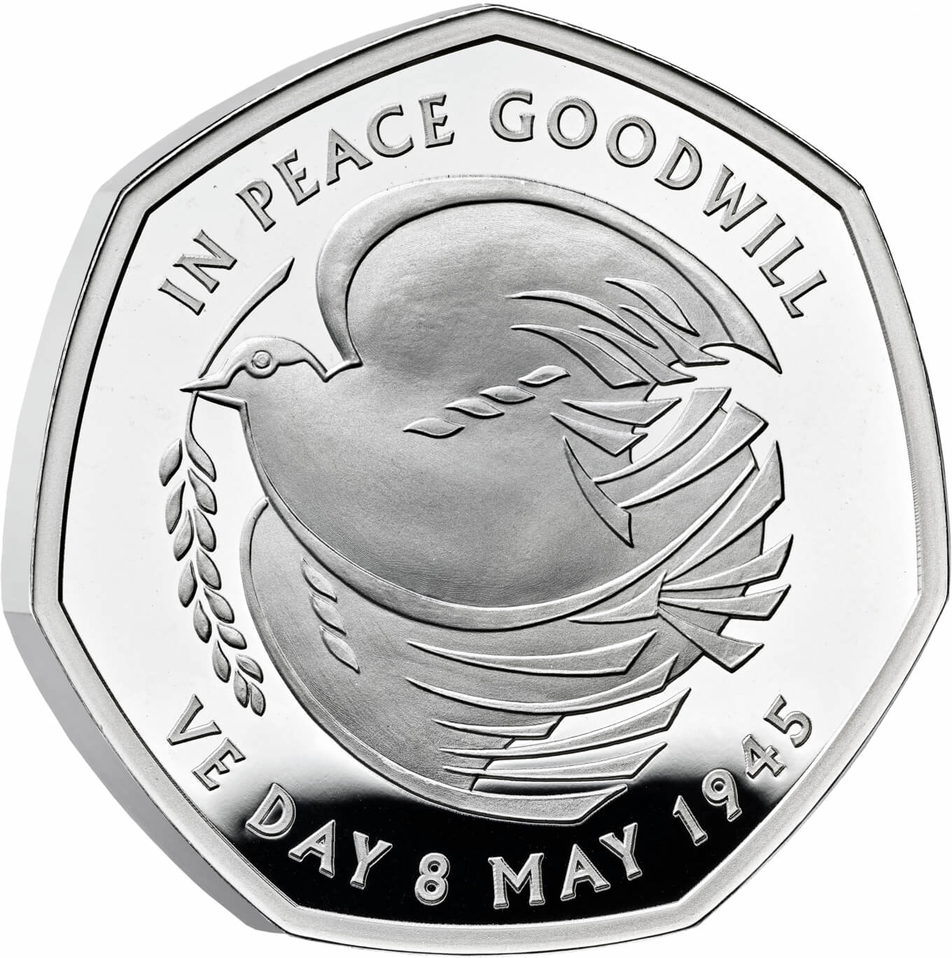 Серебряные 50 пенсов Великобритании, Королевский монетный двор выпустил серебряную монету 50 пенсов В МИРЕ ДОБРОЙ ВОЛИ, которая выходит в серии “80-я годовщина Дня Победы”.