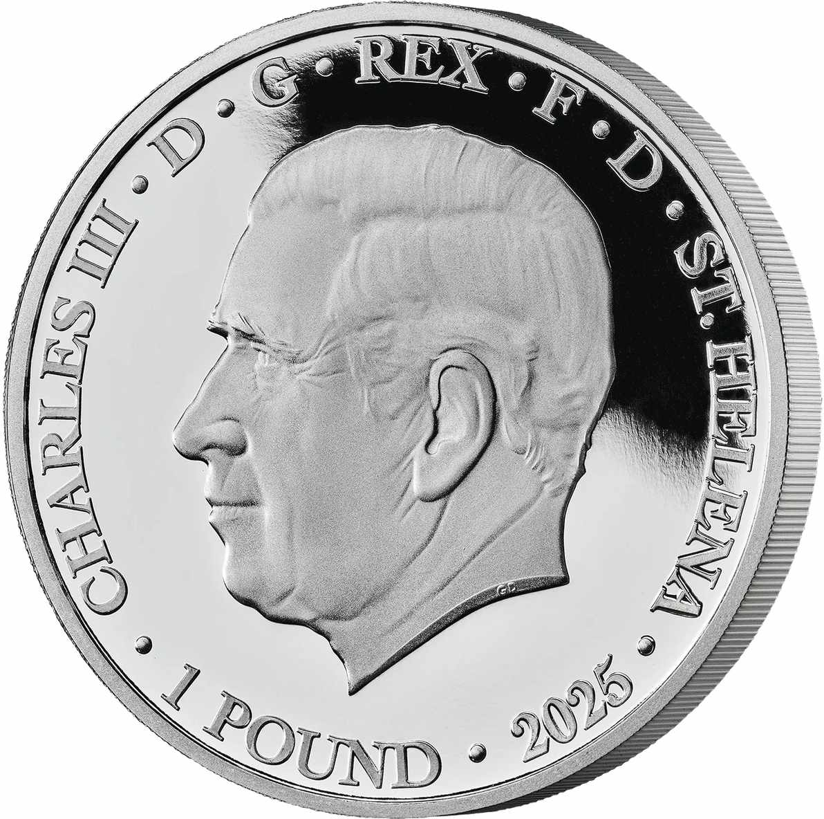 по окружности отчеканена надпись «CHARLES III · D · G · REX · F · D · ST. HELENA · 1 POUND · 2025 ·», в переводе с латыни легенда означает: Карл Третий, милостью Божьей, король, защитник веры, Святая Елена.