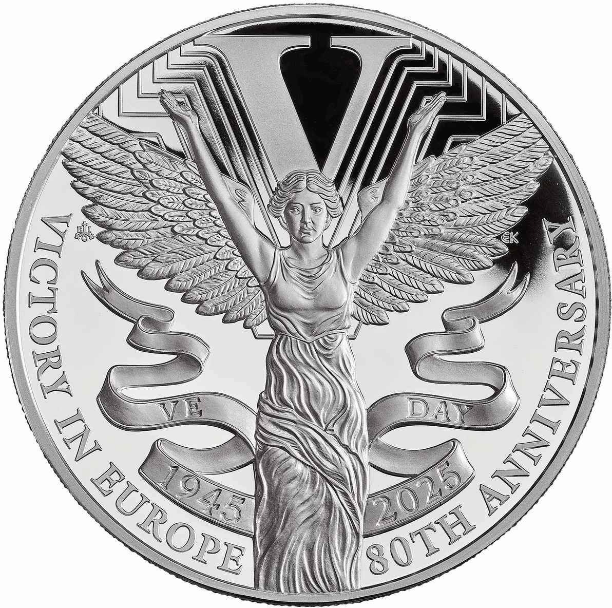 в центре изображена крылатая фигура Ники, греческой богини победы, с поднятыми в праздновании руками. За ней большая буква V, означающая Победу. На ленте за ней “VE DAY 1945 2025”. В верхнем левом поле знак монетного двора “EIC” Ост-Индской компании — буквы разделены стрелками, расходящимися от центра, вокруг которого они расположены. В правом верхнем поле инициалы дизайнера “EK”. Внизу, около обода, прерываемая фигурой Ники, надпись “VICTORY IN EUROPE 80TH ANNIVERSARY”.