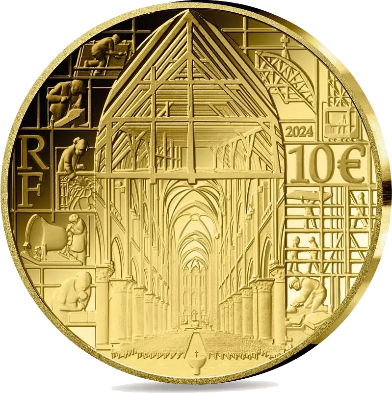 Золотые 10 евро Франции, в 2024 года Парижский монетный двор (Monnaie de Paris) отчеканил для Франции монету 10 евро Нотр-Дам де Пари, которая вышла в серии “Французское совершенство”.