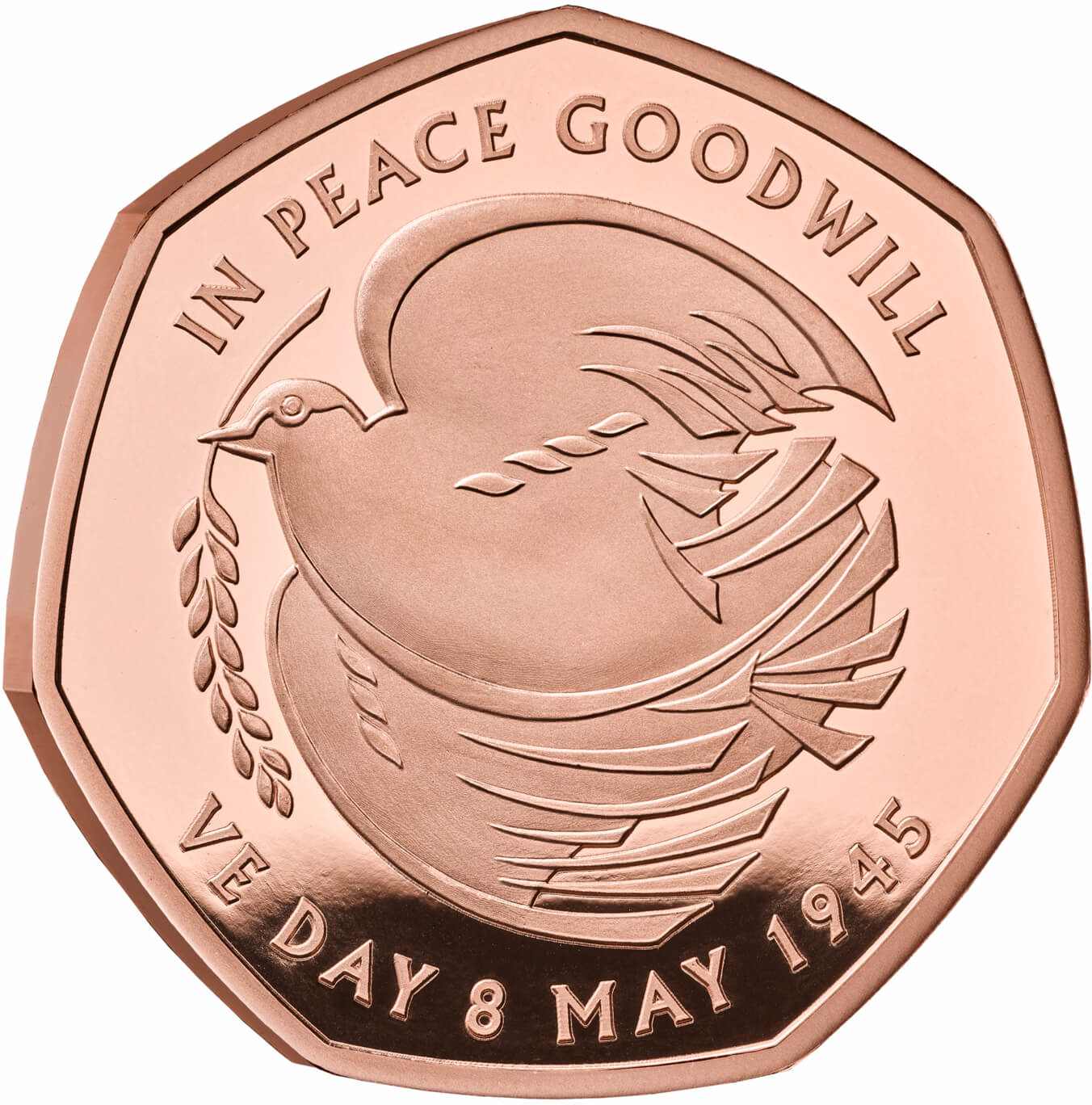 Золотые 50 пенсов Великобритании, Королевский монетный двор выпустил золотую монету 50 пенсов В МИРЕ ДОБРОЙ ВОЛИ, которая выходит в серии “80-я годовщина Дня Победы”.